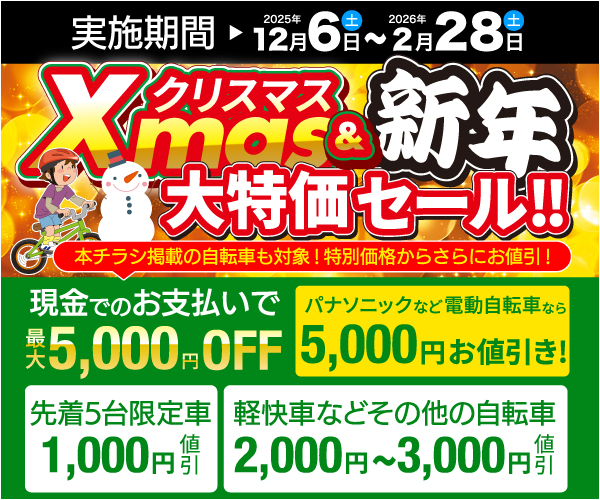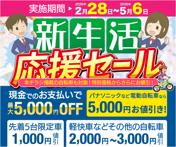 当店では新品の自転車・電動アシスト自転車はもちろん、中古自転車も取り扱っております!お値段は9,900円(税別)から!整備を施した安心・安全の自転車をご提供しております。